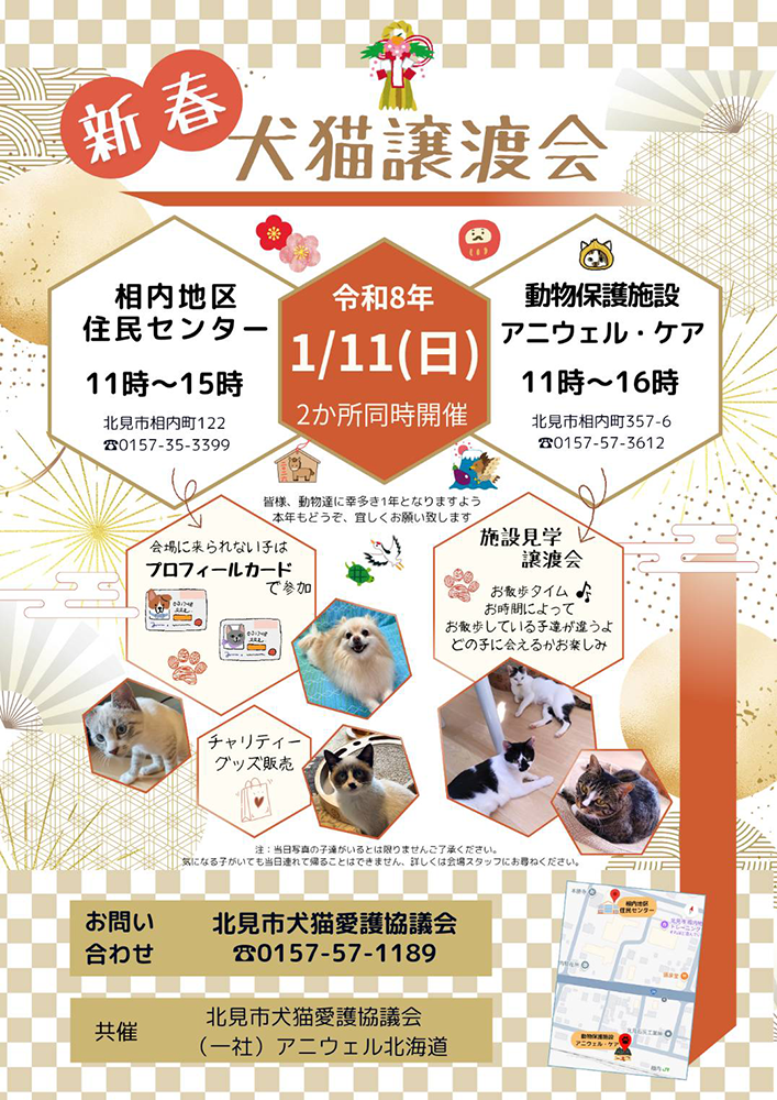 1月11日(日)、相内地区住民センター及び、動物保護施設アニウェル・ケアの2箇所で「新春/犬猫譲渡会」が開催されます。
